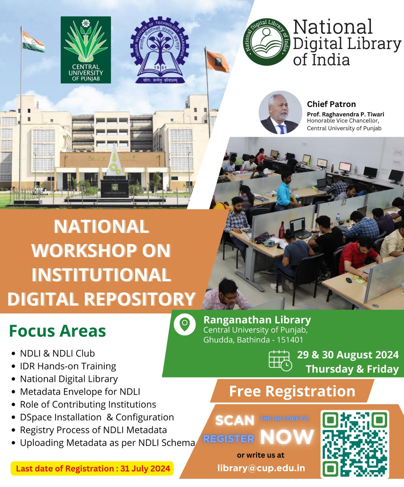 The Ranganathan Library of the Central University of Punjab, Ghudda-Bathinda, in collaboration with the National Digital Library of India, IIT Kharagpur, is organizing a two-day workshop on Institutional Digital Repository from August 29-30, 2024, at CU Punjab.